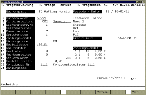 2.0 Auftragserfassung Konsignationslageraufträge werden innerhalb der Auftragserfassung mit definierten Erfassungsmasken erfasst.. In einem Individualfeld kann im Auftragskopf die Lagernummer für das Konsilager erfasst werden. Wird keine Lagernummer erfasst, erfolgt später keine Buchung für dieses Lager.