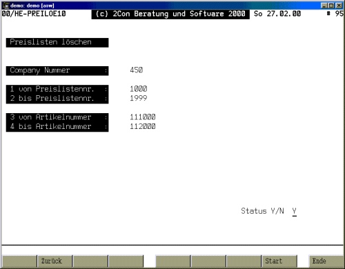 Wenn Sie das Programm unter SCOPE aufgerufen haben (unser Beispiel), geben Sie zunächst die Company-Nummer ein. Danach werden die weiteren Felder sequentiell abgefragt. Vom Statusfeld aus können Sie die einzelnen Felder über die Anwahl der entsprechenden Nummer nochmals ändern. Status N erlaubt die nochmalige Anwahl aller Felder. Über Status Y oder Softkey Start beginnen Sie mit der Verarbeitung. Während der Verarbeitung wird der aktuelle Datensatz in einem Fenster angezeigt. Über Rasttaste R1 können Sie einen Zähler der gelöschten Sätze einblenden. Über CTRL-B kann der Programmlauf abgebrochen werden. Mit Ende beenden Sie das Programm ohne Verarbeitung.